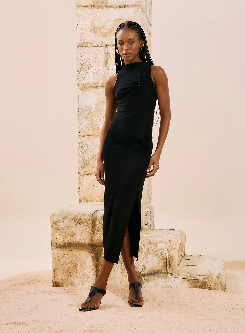 O vestido é confeccionado em tecido canelado preto, com modelagem midi e detalhe torcido no busto e na lateral. Possui decote fechado e sem mangas, ideal para quem busca uma peça versátil e elegante. O caimento ajustado realça a forma do corpo com conforto.
